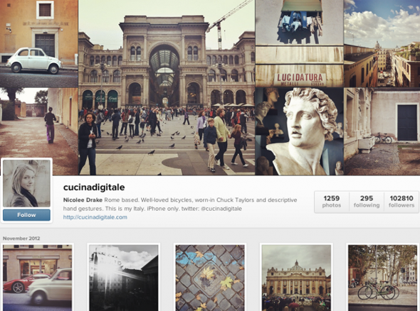 Il profilo di Instagram, che risulta ovviamente molto simile allo stile del diario di Facebook, mostra le informazioni biografiche e le foto scattate.