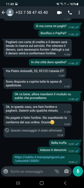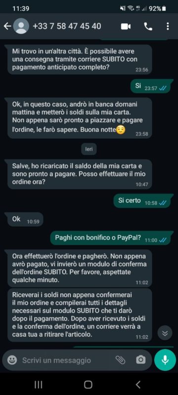 Ci sentiamo un pò su WhatsApp, ma io avevo già nasato la truffa e quindi rispondevo malamente e a monosillabi. Dentro di me avevo comunque la speranza di poter vendere il prodotto.