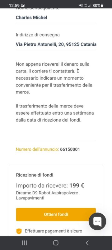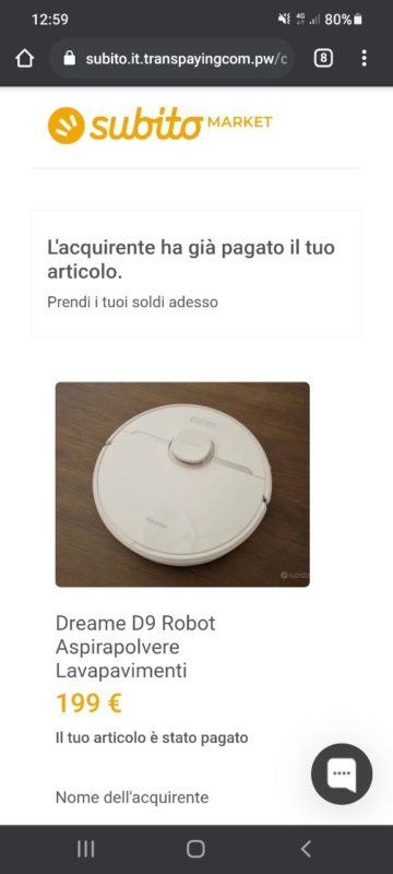 C'è uno straniero con WhatsApp estero, che parla male italiano ma è molto cordiale nei messaggi, che vive a Catania e va in banca il sabato mattina, che vuole comprare il mio robot Dreame D9 tramite Subito.it.