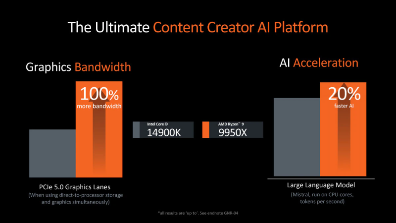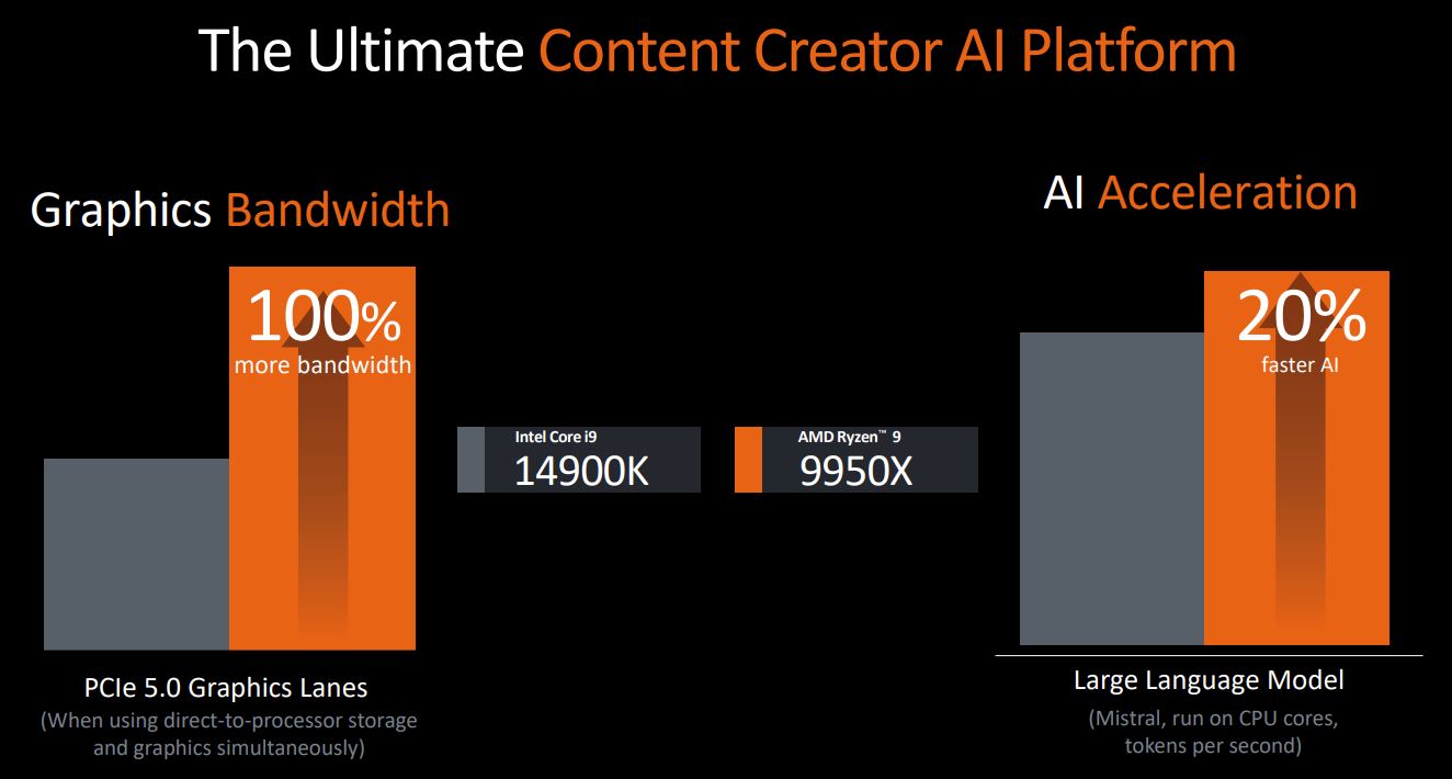 AMD sottolinea che il nuovo chip offre una bandwidth grafica il 100% maggiore rispetto al processore Intel quando si usano simultaneamente una GPU e un SSD collegati direttamente alla CPU, mentre svolgendo LLM direttamente sui core del processore il 9950X è il 20% più veloce del 14900K nei carichi IA.