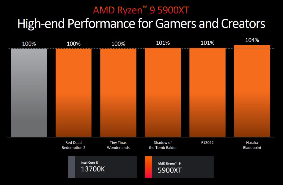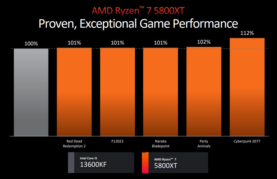 AMD indica prestazioni in gaming per il Ryzen 9 5900XT rispetto al Core i7-13700K simili se non leggermente superiori e così per il Ryzen 7 5800XT rispetto al Core i5-13600KF.