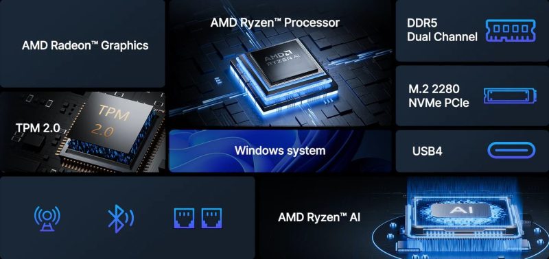 Non solo: è anche uno dei sempre più numerosi mini PC alimentati da un processore AMD Ryzen AI 9 HX 370 Strix Point a 12 core e 24 thread basato su architettura Zen 5 e grafica RDNA 3.5 a 16 core.