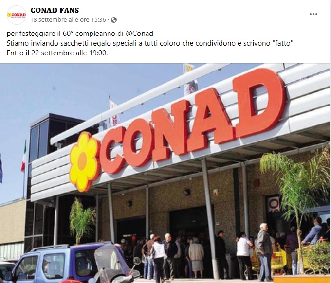 Attenzione alla nuova truffa Facebook "Per festeggiare il 60° compleanno di @Conad stiamo inviando sacchetti regalo speciali a tutti coloro che condividono.."