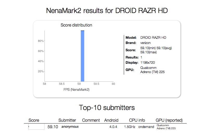 Quelli riportati in alto sono i risultati che il device ha ottenuto e dalla quale è possibile ricavare maggiori informazioni, a partire dal processore, uno Snapdragon S4 da 1.5 GHz. Per quanto riguarda il display, troviamo uno schermo in HD a 720p con risoluzione da 1196x720, il che fa presagire la presenza dei 3 tasti a schermo di Ice Cream Sandwich che andranno a coprire il restante spazio arrivando ad una risoluzione totale di 1200x720 pixel.