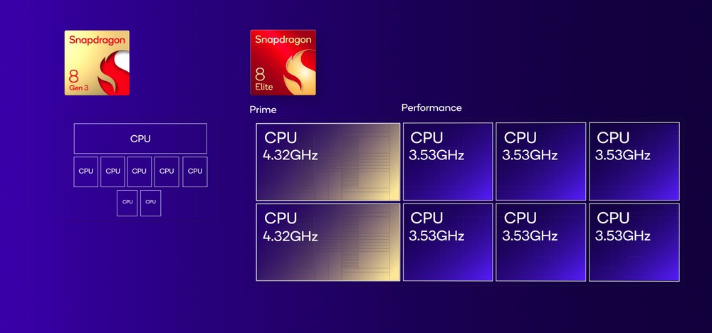 Sparisce la famiglia di CPU Kryo, per lasciare posto alla seconda generazione di core Oryon, basati sull'architettura completamente custom di Qualcomm realizzata con il processo produttivo a 3 nm di TSMC.