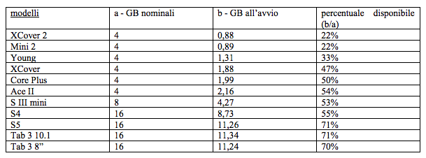 La tabella mostra, in particolare, che tra i modelli base della gamma, per i quali sono indicati 4 GB di memoria, la memoria disponibile per il consumatore è significativamente inferiore a quella indicata: per alcuni modelli solo del 22% (il modello XCover 2 ed il Mini 2), per altri comunque solo di un terzo (lo Young al primo avvio dispone di 1,3 GB).