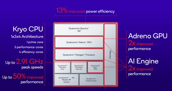 Per quanto riguarda l'intelligenza artificiale, il Qualcomm AI Engine garantisce, come detto, prestazioni doppie rispetto al predecessore suo con il 40% in più di performance per Watt.