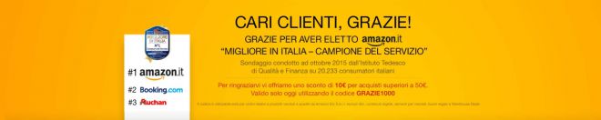 Amazon Italia è stato eletto il miglior sito in Italia per servizio offerto ai clienti nell'ambito degli e-commerce e portali di acquisto (un campione di oltre 20.000 persone ha giudicato Amazon.it come il miglior sito in Italia). Un riconoscimento importante che Amazon vuole condividere con i milioni di acquirenti. Proprio per questo, solo per oggi, 13 novembre, Amazon offre uno speciale sconto di 10€ per acquisti superiori a 50€ (in pratica se spendete 50,1€ pagherete 40,1€).