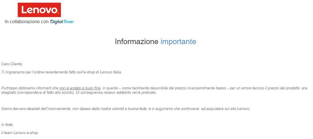 Siamo davvero desolati dell’inconveniente, non dipeso dalla nostra volontà e buona fede, e ci auguriamo che continuerai ad acquistare sul sito Lenovo.