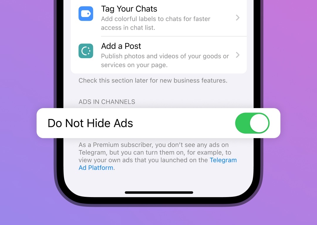 Per impostazione predefinita, con l’abbonamento a Telegram Premium vengono nascoste le inserzioni presenti nei canali.