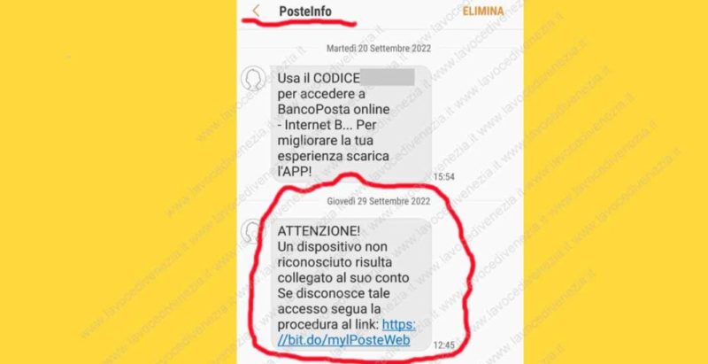 Il messaggio truffaldino che arriva dalla banca o dalla Posta