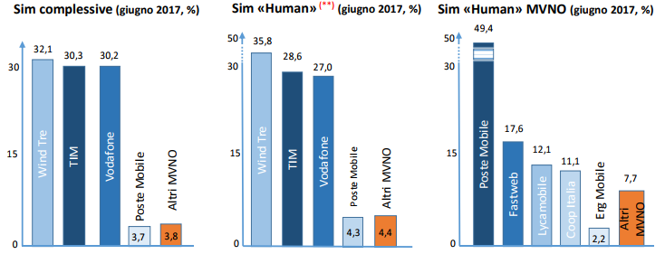 Il mercato delle SIM Human, quelle più appetibili per il mercato, si fa interessante anche per gli operatori virtuali che hanno una quota dell'8,7% con Poste Mobile che detiene il 4,3% del totale ed il 49,4% dell'intero mercato dei gestori virtuali. Poi dietro troviamo Fastweb (17,6%), Lycamobile (12,1%), CoopVoce (11,1%) e ErgMobile (2,2%).