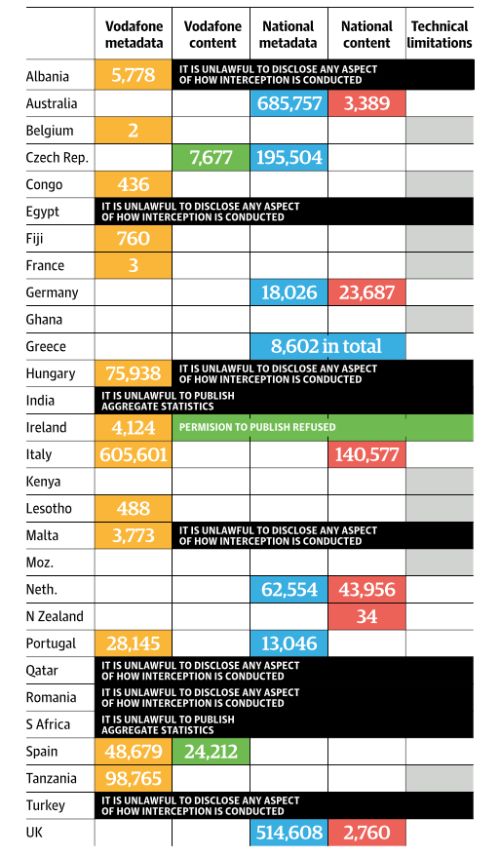 Vodafone fa riferimento all'esistenza di un network di cavi che permette ad agenzie di sorveglianza di alcuni governi di ascoltare le conversazioni e, in certi casi, di identificarne la posizione. Con questo sistema, utilizzato in molti dei Paesi dell'Unione Europea e in altri in cui l'azienda opera dove in almeno 6 nazioni vi è un vincolo di accesso diretto alle comunicazioni. Infatti Vodafone ha svelato attraverso un comunicato disponibile al download in PDF dal link al fondo dell'articolo, che le agenzie governative di alcuni Paesi in cui opera hanno l’accesso diretto alla sua rete con la possibilità di ascoltare le telefonate senza bisogno di alcuna autorizzazione, bypassando tutti i controlli che l’operatore porrebbe in atto per proteggere le informazioni dei propri clienti.