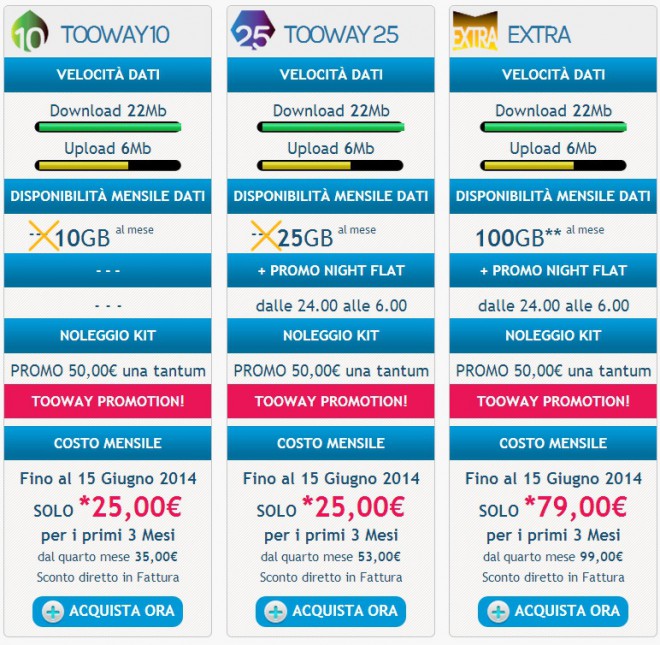 Tooway 10 e Tooway 25 sono in promozione fino al 15 Giugno al costo di 25€ al mese, per tre mesi, poi il canone tornerà sui valori rispettivi di 35 e 53 euro. Tooway Extra è anch'esso in promo per 79€ al mese per tre mesi, successivamente proposto a 99€ al mese. Incentivi non indiffernti anche per avere a disposizione in pochi giorni questa tecnologia: il kit in acquisto è scontato a 99€ (anzichè 427€) e il noleggio è una tantum in offerta a 50€.