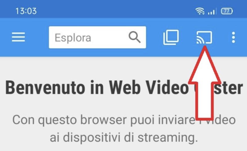 - nell'app Web Video Caster su Android, clicca sul pulsante di condivisione che si trova in alto a destra (quello indicato dalla freccia nell'immagine seguente)