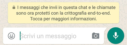 I messaggi che invii in questa chat e le chiamate sono ora protetti con la crittografia end-to-end, il che significa che WhatsApp e terze parti non possono leggerli o ascoltarli.