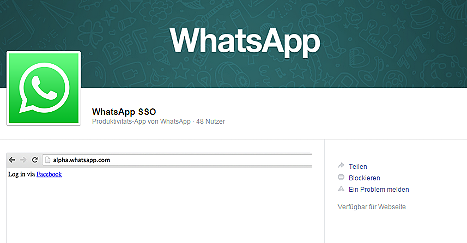 Infatti all'indirizzo alpha.whatsapp.com è presente soltanto la funzione di Log-In via Facebook che vi rimanda ad una web-app ospitata direttamente su Facebook chiamata WhatsApp SSO (acronimo che starebbe per single-sign-on)