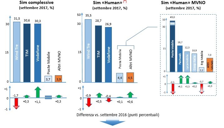 TIM e Vodafone appaiate dietro in classifica con una lotta al secondo posto che non vede un vincitore netto, 30,6% di TIM contro il 30,3% di Vodafone sebbene abbiano eroso parte dei clienti a Wind Tre che però resta distante sopratutto nelle SIM definite umane.