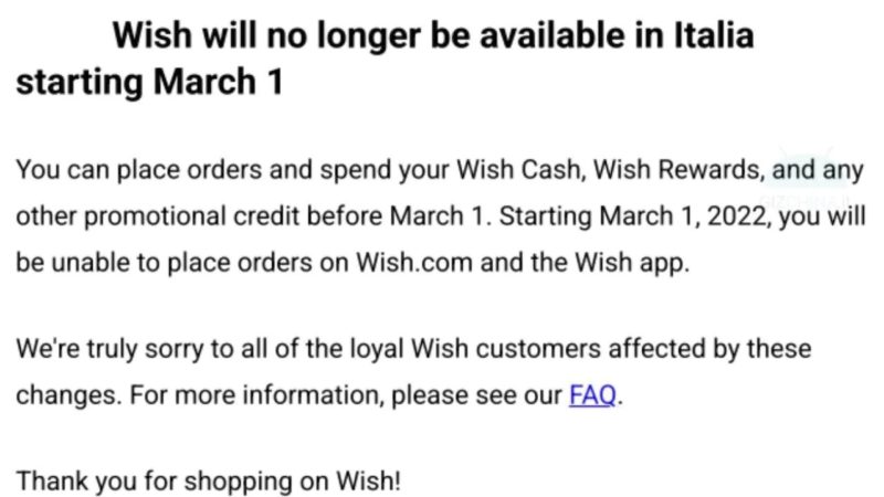 In breve, Wish chiuderà ogni operatività in Italia a partire dal 1° marzo 2022.