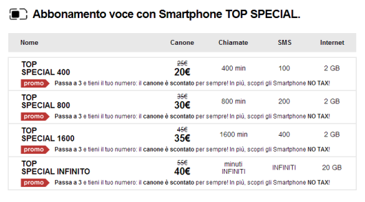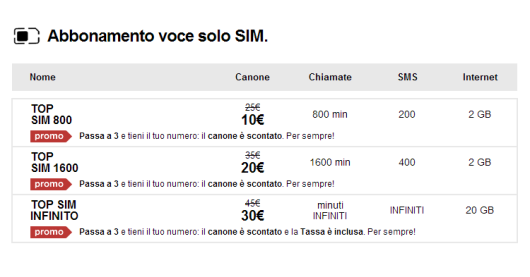 - Top Special 800: 30€ invece di 35€ con portabilità da altro operatore – 800 minuti, 200 SMS, 2GB internet