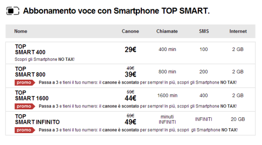 - Top Smart 400: 29€ – 400 minuti, 100 SMS e 2GB internet