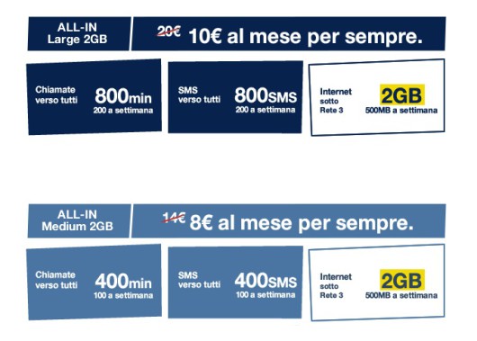 - ALL-IN Medium 2GB: 400 minuti verso tutti (100 a settimana), 400 SMS verso tutti (100 a settimana) e 2 GB di internet (500mb a settimana) a 8€ al mese invece di 14€