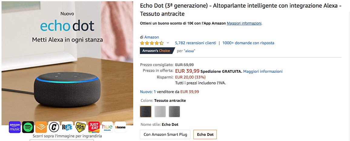 Echo Dot (3ª generazione) - Altoparlante intelligente con integrazione Alexa - Tessuto antracite - 39 EURO AL POSTO DI 59 EURO