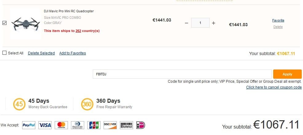 Dovete aggiungere il drone al carrello, loggarvi al vostro account GearBest e poi inserire il codice per vedere lo sconto.