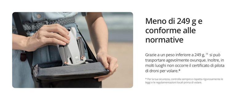 - Peso inferiore a 249 g, certificazione Classe C0 - Essendo ultraleggero, Mini 3 è autorizzato a volare nelle categorie A1 e A3. Gli operatori non devono sostenere alcun test. Il piacere di volare senza lunghi tempi di attesa