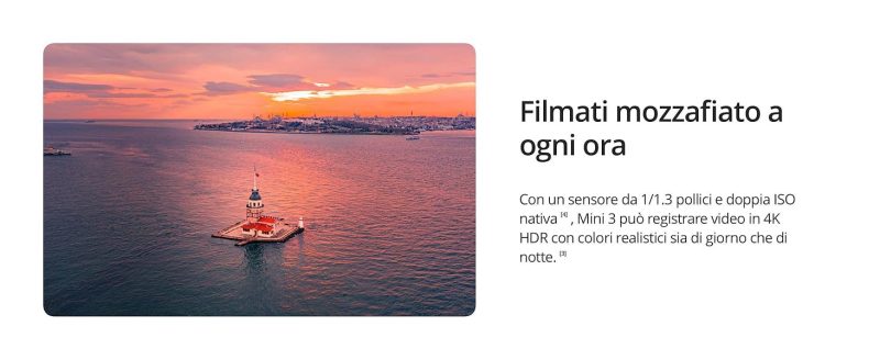 - Immagini straordinarie in 4K UHD - Registrazione video in 4K HDR per riprese aeree nitide. Con doppia ISO nativa, Mini 3 consente di acquisire dettagli nelle luci e nelle ombre, sia di giorno che di notte