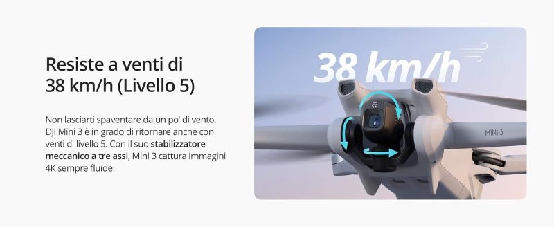 - Resiste a venti di 38 km/h (Livello 5), stabilizzatore a tre assi - Mini 3 resiste a venti di 38 km/h (Livello 5) e con lo stabilizzatore a tre assi cattura immagini 4K fluide. Grazie a potenti motori brushless, decolla ad altitudini fino a 4.000 m.