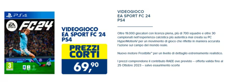 Segnalo infatti che da Esselunga è possibile acquistare EA SPORTS FC 24 per PS4 al prezzo più basso di sempre: solo 69,90€ al posto di 79,90€.