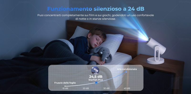 Il proiettore ETOE Starfish Plus è progettato per offrirti un'esperienza di visione senza interruzioni. Con un livello di rumorosità di soli 24 dB, è estremamente silenzioso, permettendoti di goderti il tuo film senza fastidiosi rumori di fondo.