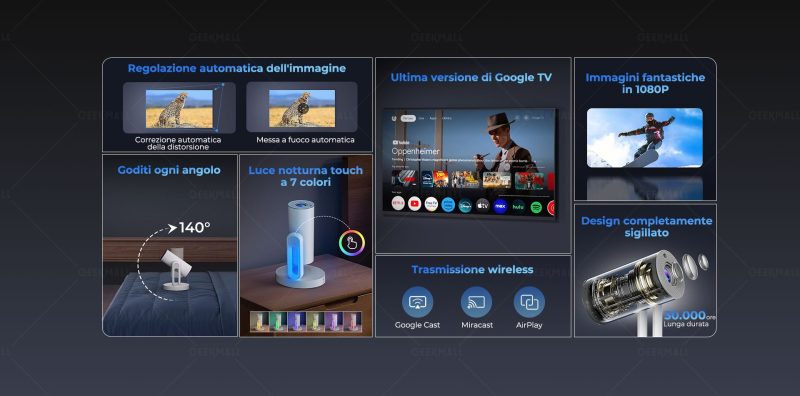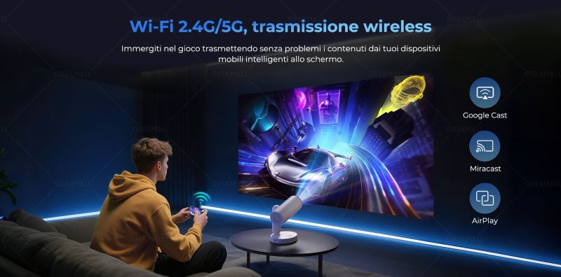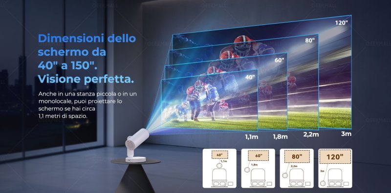 La flessibilità è un'altra caratteristica chiave. Grazie alla sua struttura, il proiettore può ruotare fino a 140°, permettendoti di proiettare su pareti, soffitti o qualsiasi superficie desiderata.