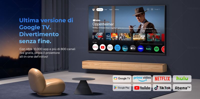 Il cuore di questo dispositivo è l'integrazione di Google TV, che apre le porte a un universo di contenuti. Con il supporto ufficiale per Netflix e l'accesso a oltre 10.000 app come Prime Video, Disney+ e YouTube, non rimarrai mai a corto di opzioni.