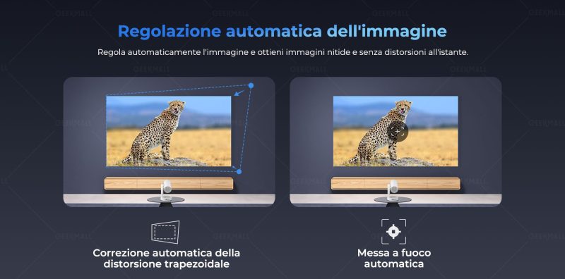 Dimentica i fastidiosi aggiustamenti manuali: la messa a fuoco automatica e la correzione trapezoidale lavorano in sinergia per garantirti un'immagine sempre nitida e proporzionata, indipendentemente dall'angolo di proiezione.