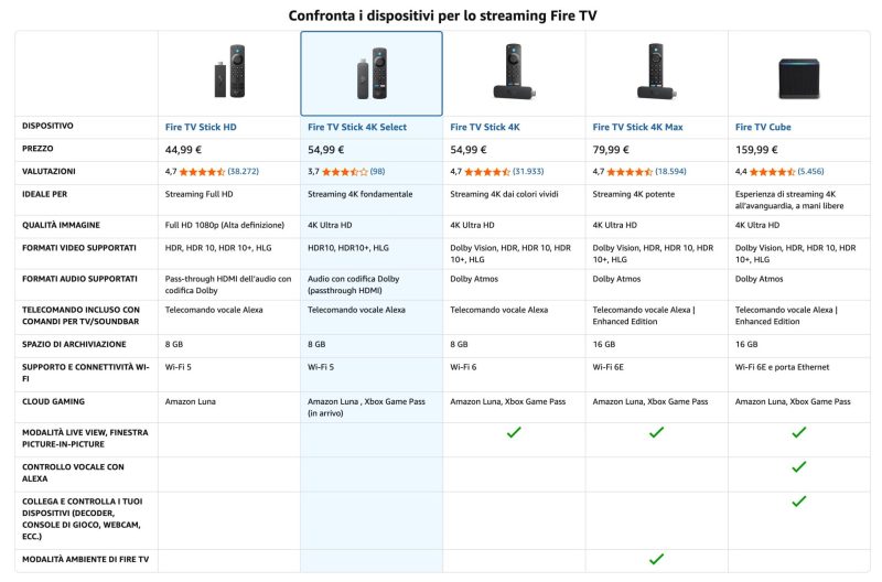 Per aiutarti ancora di più, ecco una tabella che spiega in modo dettagliato analogie e differenze tra tutti i modelli di Fire TV Stick. In questo modo potrai scegliere la Fire TV Stick perfetta per le tue esigenze.