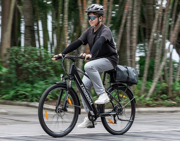 Bicicletta da trekking Touroll J1 da 27,5 pollici con motore da 250 W, batteria da 36 V 15,6 Ah, autonomia massima di 100 km, display LCD da 1,8 pollici, freno a disco Shimano a 7 velocità , nera