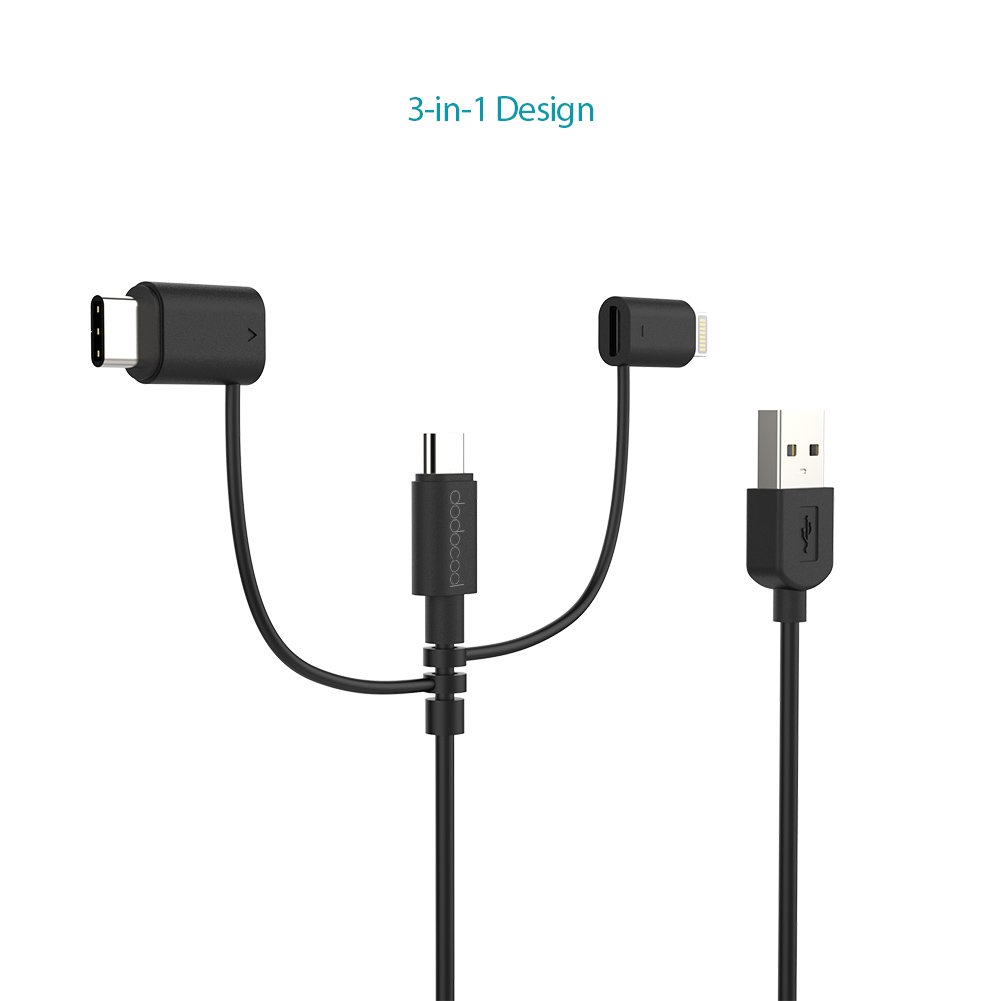 tre cavetti distinti ma con la soluzione di dodocool avrete un unico cavo con 3 cavi in uno. Infatti avrete sia la microUSB classica, che la porta USB Type-C ed anche la porta Lighting.