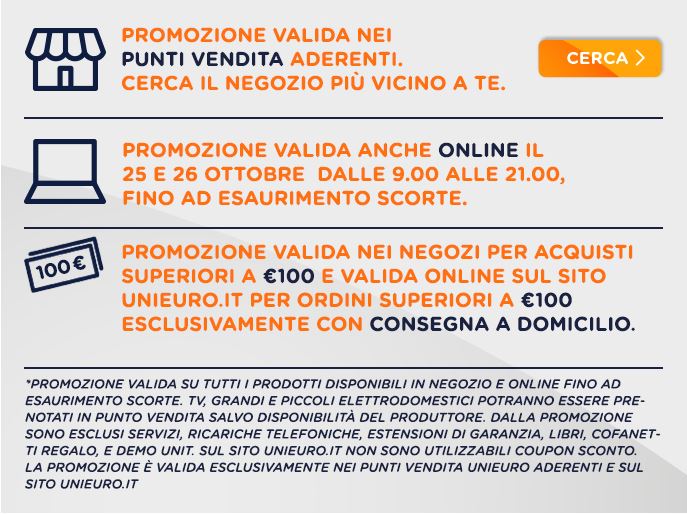 Sono escluse dall’offerta le ricariche telefoniche, i servizi aggiuntivi, i libri, le estensioni di garanzia, i cofanetti regalo e le demo unit; infine, sul sito di Unieuro, non sono utilizzabili buoni sconto.