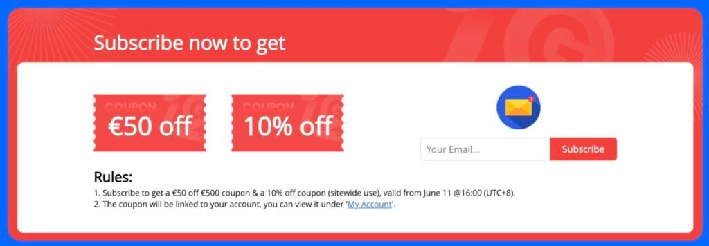 Puoi inoltre ottenere in modo casuale dei coupon speciali individuali del valore fino a 500€ iscrivendoti con la tua email.