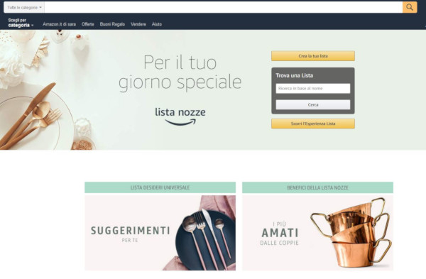 La lista nozze si crea su Amazon. Amazon ha lanciato il nuovo servizio Lista Nozze che permette di creare una lista nozze personalizzata grazie ad Amazon AssistantLista nozze su AmazonDa oggi su Amazo...