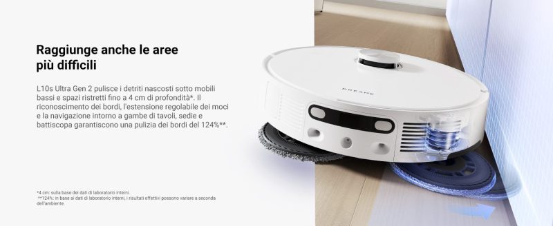 Progettato per una pulizia più intelligente ed efficiente, Dreame L10s Ultra Gen 2 offre una potenza di aspirazione Vormax™ di 10.000 Pa insieme alla tecnologia MopExtend™ RoboSwing per raggiungere ogni angolo.