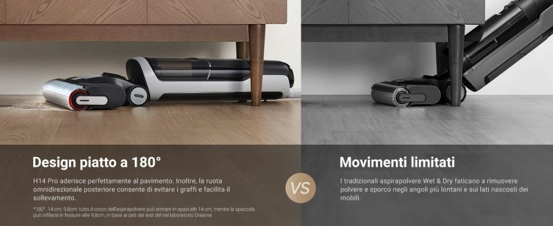 Con una testina flessibile a 180°, l'H14 Pro raggiunge facilmente gli spazi sotto i mobili garantendo una manovrabilità ottimale. Con una potenza di aspirazione di 18.000 Pa, rimuove sia lo sporco umido che quello secco in un unico passaggio.