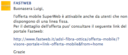 Ho chiamato il supporto on-line e mi hanno rimandato ad un rivenditore poiché on-line non effettuano attivazioni mobili. Ho chiamato il rivenditore e mi ha avvisato che l'offerta è attivabile solo per chi a casa ha Fast-Web!