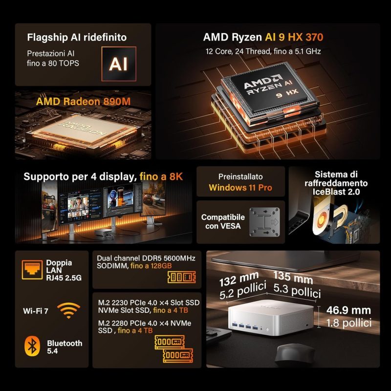Unendo la potenza dell'IA, prestazioni grafiche sorprendenti e una costruzione di altissima qualità, il mini PC A9 Max non è solo un dispositivo, ma la soluzione definitiva per chi esige il massimo della tecnologia in un design compatto ed elegante.