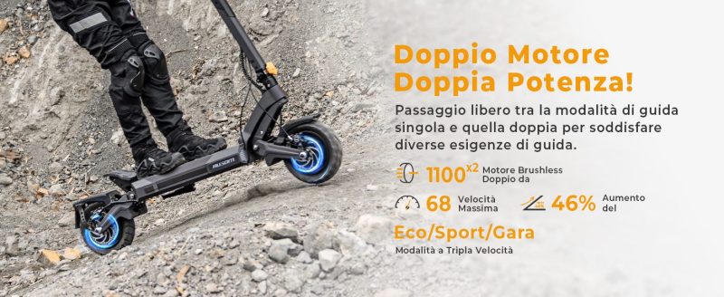 Grazie a questa doppia promozione, il modello di punta Ausom DT2 Pro raggiunge il prezzo finale di 854 euro, una cifra eccezionale per un monopattino elettrico dotato di doppio motore e specifiche premium.