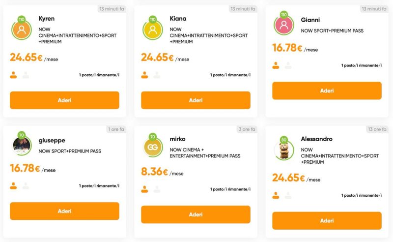 - Nella nuova pagina che si apre, cerca un gruppo con posti disponibili per l'abbonamento NOW SPORT+PREMIUM PASS a 16.78 euro al mese