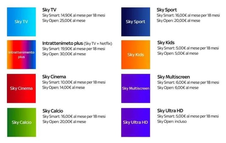 L’offerta Sky Open è più costosa rispetto a Sky Smart, ma è più flessibile e, soprattutto, non costringe l’abbonato a vincolarsi con un contratto di molti mesi/anni. Ecco i prezzi dei pacchetti dell’offerta: