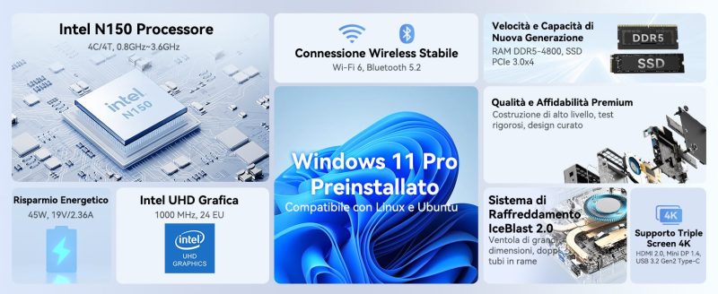 Detto questo, devi sapere che il Mini PC (che misura appena 117 x 112 x 34,2 millimetri) può contare su una buona dotazione di serie, a partire dal nuovissimo chipset Intel N150 di 12a generazione (in sostituzione del precedente N100) e scheda video integrata Intel UHD di dodicesima generazione.